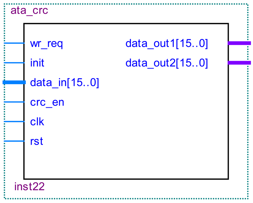 The plain text CRC checkout module and the cryptograph CRC checkout module have the same structure. Their details are shown in Figure 16. The plain text CRC module is located in the virtual IDE device. The cryptograph CRC module is located in the virtual host device. Both of them will be initialized with a seed of 4ABAh at the beginning of an Ultra DMA burst. At the end of the Ultra DMA burst, the host device(or the virtual host device) will send the CRC calculation results to the hard-disk (or the virtual IDE device). If the CRC data in the host device(or the virtual host device) does not match with the calculated value in its own CRC calculation, the hard-disk (or the virtual IDE device) will report that the error has occurred.
