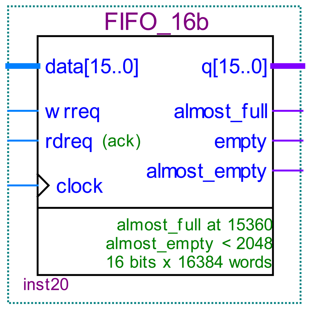 The 16 bit width FIFO module (Figure 10) is indicated in Figure 17. The module controls the data transfer by the empty pin, the almost_full pin and almost_empty pin. When the memory capacity of FIFO is nearly full, the almost_full pin will inform the host device to pause the UDMA transfer. When the FIFO memory capacity is nearly null, the almost_empty pin will inform the host device to resume the UDMA transfer. When the FIFO memory capacity is empty, the empty pin will inform the host to send the data or finish the UDMA transfer.