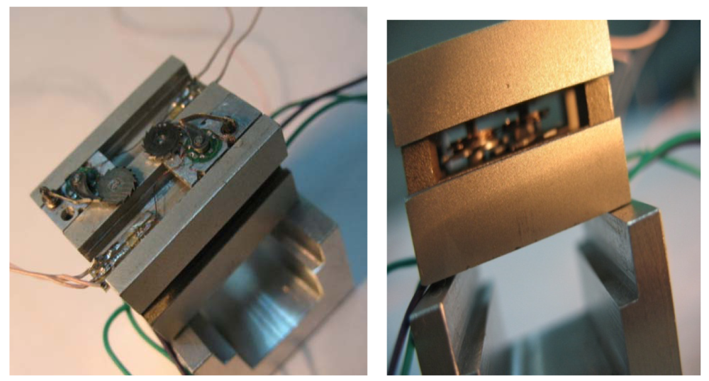 When the password is received by the MEMS coded lock, the driving motor A/B drives CMG A/B running to a specified position. When the user's password is right, two groups of CMGs keep away from contacting with each other. The correct password drives the CMGs to the right position. Then the photoelectricity coupler is opened and the feedback signal is sent. When the user's password is error, the MEMS coded lock is locked and needs to be reset. When the system is being reset, the reset motor puts up the pawl, and the corresponding group of CMGs returns to the right position. The photo of the MEMS coded lock is shown in Figure 22.