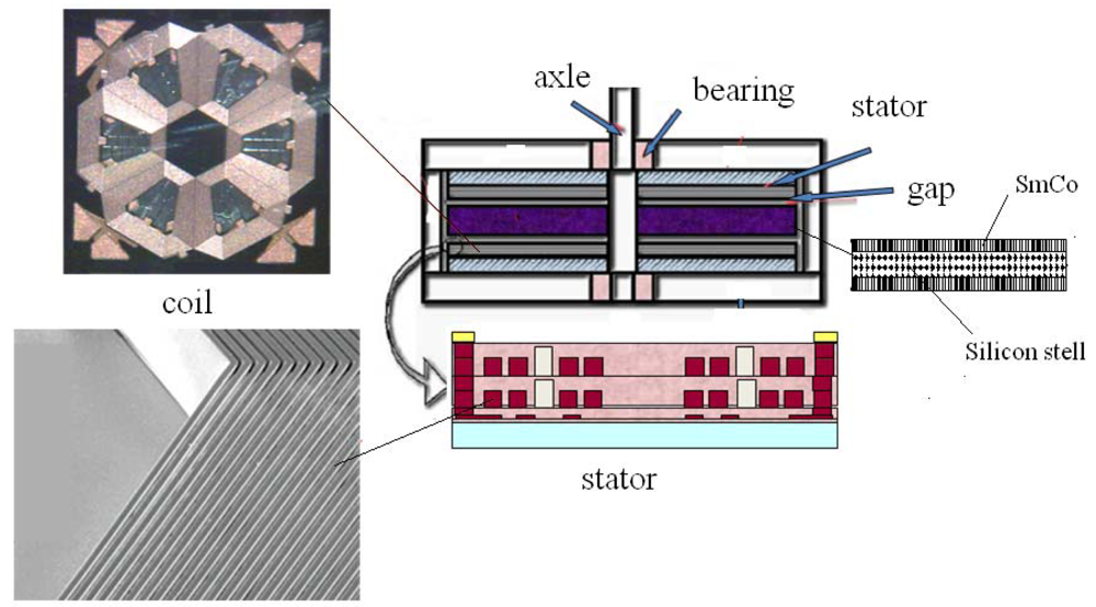 - Yang, C.; Zhao, X.; Ding, G.; Zhang, C.; Cai, B. An axial flux electromagnetic micromotor. J. Micromech. Microeng 2001, 11, 113–117. [Google Scholar]