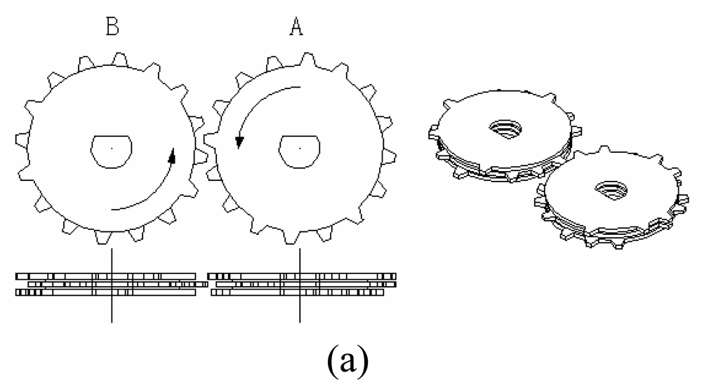 - Zhang, W.P.; Chen, W.Y.; Zhao, X.L.; Li, X.Y.; Jiang, Y. A novel safety device with metal counter meshing gears discriminator directly driven by axial flux permanent magnet micro-motors based on MEMS technology. J. Micromech. Microeng 2005, 15, 1601–1606. [Google Scholar]