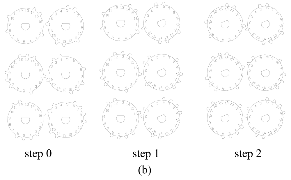 Table 1 shows the parameters of the rathcet and pawl mechanism. The two groups of CMGs corresponding to the code sequence“ABAABABBBBAABBBAAABAAABBAABBABAB”, is illustrated in Figure 24. The two groups of CMGs rotate in anticlockwise direction [Figure 24(a)]. In step 0, CMG A and CMG B are the initial state. In step 1, “A” in the code sequence is received, CMG A rotates a step (22.5°) in the anticlockwise direction, and CMG A and CMG B pass through without interfere. In step 2, if the right code “B” is received, the CMG B rotates a step (22.5°) in the anticlockwise direction, and CMG A and CMG B pass through without interfere. Otherwise, in step 2, if the wrong code “A” is received, CMG A rotates in the anticlockwise a step(22.5°), and then the the teeth in the middle layer of the CMG B and CMG A will interfere in the next step. Thus two groups of CMGs not only rotate in anticlockwise direction, but also rotate in reverse (the ratchet wheels and pawls can hold CMGs to rotate in the anticlockwise direction), the discriminator will be locked.