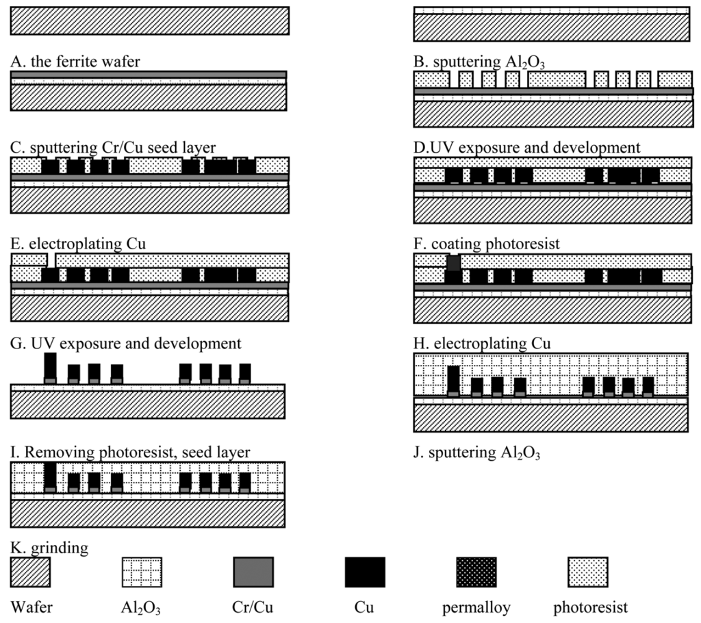 In [15], the electrostatic actuator has been constructed using a multi-level, LIGA-like process. In our work, the two-layered coils of the electromagnetic motor's stators are also fabricated by an similar multi-leve process. Figure 25 is the flowchart of the micromaching process. After the step K, the second layer coil begins to been fabricated. The second layer coil's micromaching process is similar to the first layer coil' micromaching process, so we only give the process flowchart of the first layer coil.