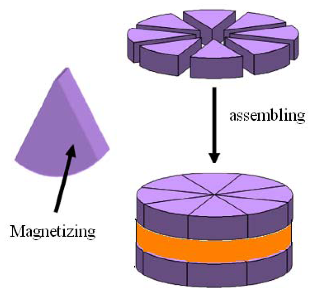 WEDM(Wire Electrical Discharge Machining) has been used to fabricate microstructure [16]. In this paper, the permanent material of the rotor is SmCo alloy(Sm 25.5%, Co 52.5%, Fe 15%, Zr 3%). SmCo sectors are cuted by Wire Electrical Discharge Machining. Then these sectors are Magnetized and assembled on the circular silicon stell sheet (Figure 26).