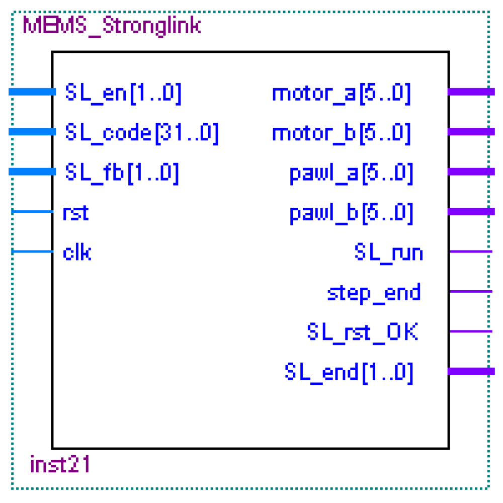 When SL_en signal is valid, the signals from SL_code pins are used as the driving series of the MEMS coded lock, and the SL_run pin of the module informs the cipher key management module to receive the feedback signals of the MEMS coded lock. At the same time, the module compares the feedback signals of the MEMS coded lock with the user's password to affirm whether the driving operation of the MEMS coded lock is finished normally or not.