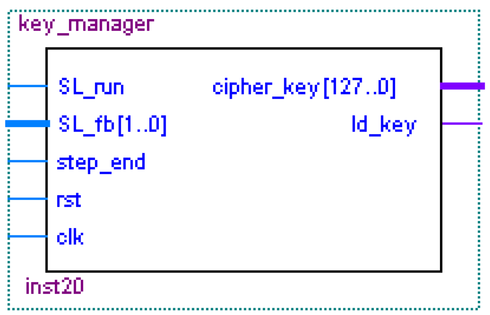 The cipher key management module (Figure 29) produces the 128-bit cipher key according to the feedback signals of the MEMS coded lock. If SL_run signal is valid, the cipher management module changes the status from the idle status to the working status and begins to run. If the step_end signal is valid, the cipher management module knows that MEMS coded lock has rotated a big step. SL_fb signal from the MEMS coded lock is used to generate the encryption/decryption key. The signals from Cipher_key pins will provide 128 bit key for the encryption/decryption module. After the cipher key is generated, ld_key tells the encryption/decryption module to load the key.