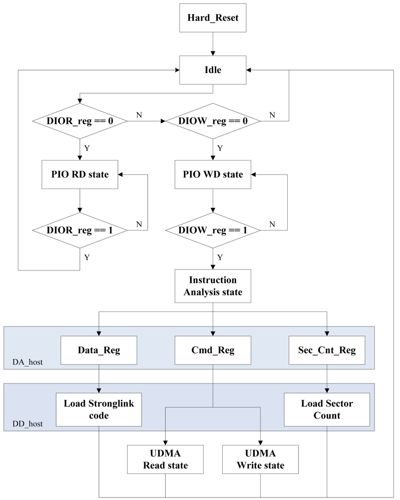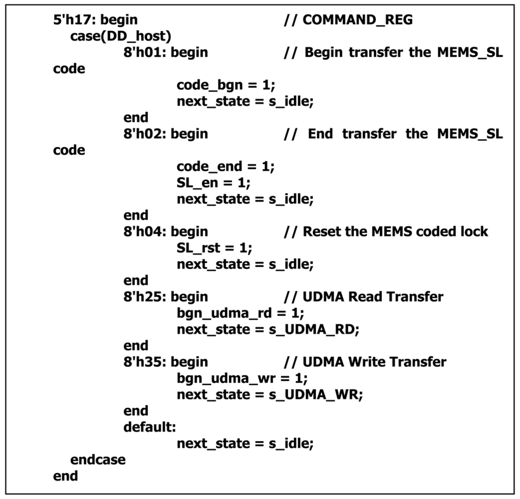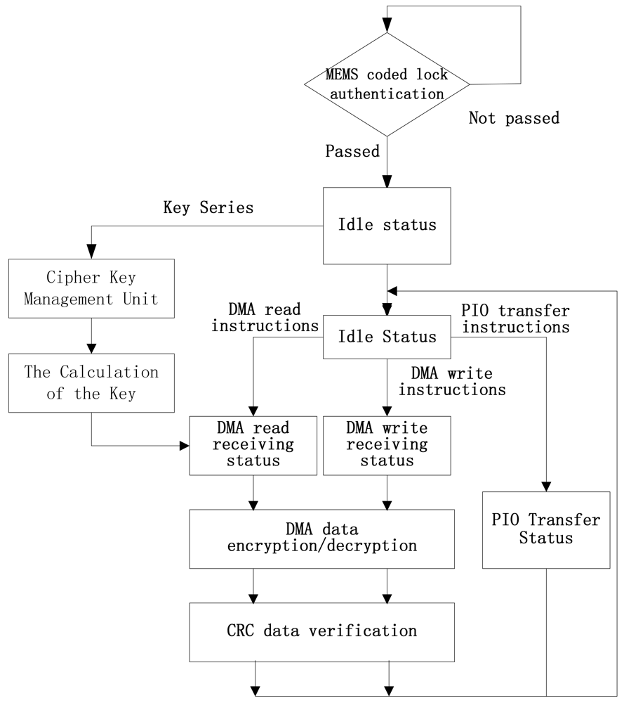 According to the command register value, the command decoder module creates the UDMA channel, the PIO channel and MEMS coded lock control channel. The data through the UDMA channel is encrypted or decrypted by AES arithmetic. The data through the PIO channel is directly transferred. Through the MEMS coded lock control channel, the driving and reset instructions of MEMS coded lock are transferred. Except for these command register values, such as 08H (DEVICE RESET), ECH (IDENTIFY DEVICE), 25H (READ DMA EXT) and 35H (WRITE DMA EXT), the reserved 01H, 02H and 04H are used to express the driving start, the driving end and the reset instructions of the MEMS coded lock, respectively (Figure 9).