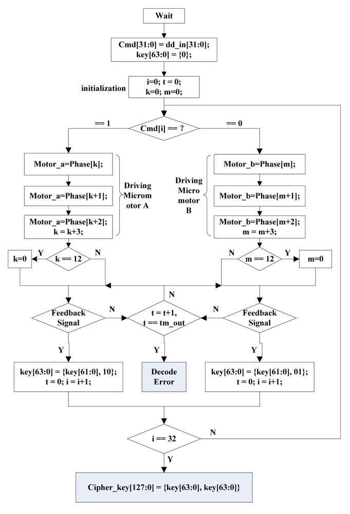After the discrimination micromotors run a step, the corresponding switch signal (off or on) of the coupler is outputted to the key management module. When discriminating operation is correct, two groups of CMGs alternately rotate 32 steps. After each step movement is finished, 2 bit feedback signal is outputted. Thus the cipher key management module totally received 64 bit feedback signals. After that, the key management module combines 64 bit feedback signals to 128 bit key, which will be sent to the encryption/decryption module.