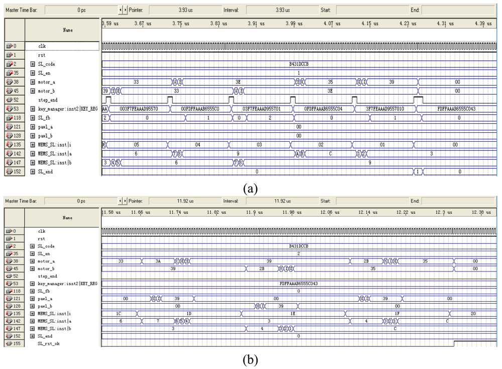During the resetting process, the ratchet wheel steps a small phase in the positive direction. Moreover, the pawl steps 3 small phases and stops. Afterward, the ratchet wheel steps 4 small phases in the reverse direction and stops. Finally, the pawl_a or the pawl_b signal of the MEMS coded lock module is set to ‘0’, and the pawls are resumed to the original position because of the leaf spring's force. Thus, the ratchet wheel is locked by the pawl. During the reset processing, the step_end signal is kept ‘0’. If the reset processing is right, SL_rst_OK is valid, which informs the ATA protocol command decoder module that the reset of MEMS coded lock is successful.