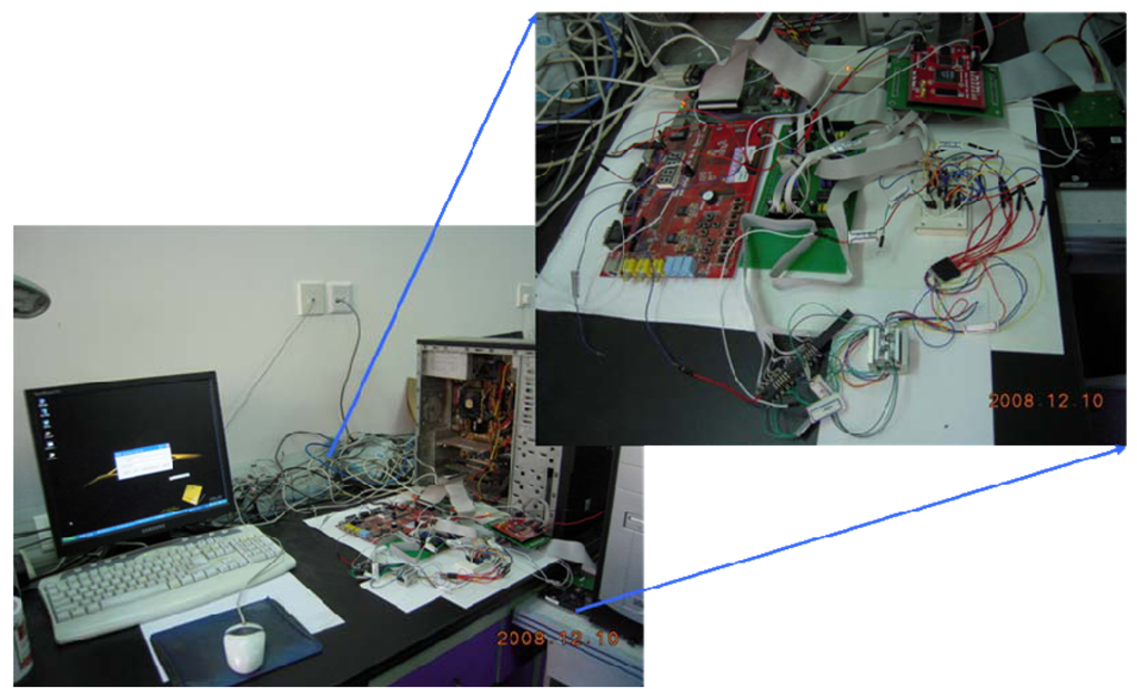 After the host computer is powered on, the USB control program is downloaded to the USB portable hard-disk interface card by Keil C702 tool [21]. Then, the VHDL program is downloaded to the FPGA portable hard-disk data encryption/decryption card by QuartusII tools [20]. Using the microscope, MEMS coded lock is adjusted to the original status. In succession, the USB portable hard-disk interface card, the FPGA portable hard-disk data encryption/decryption card, MEMS coded lock and the hard disk are linked to the portable hard disk encryption system by the cable. The functional test is done as follows:
