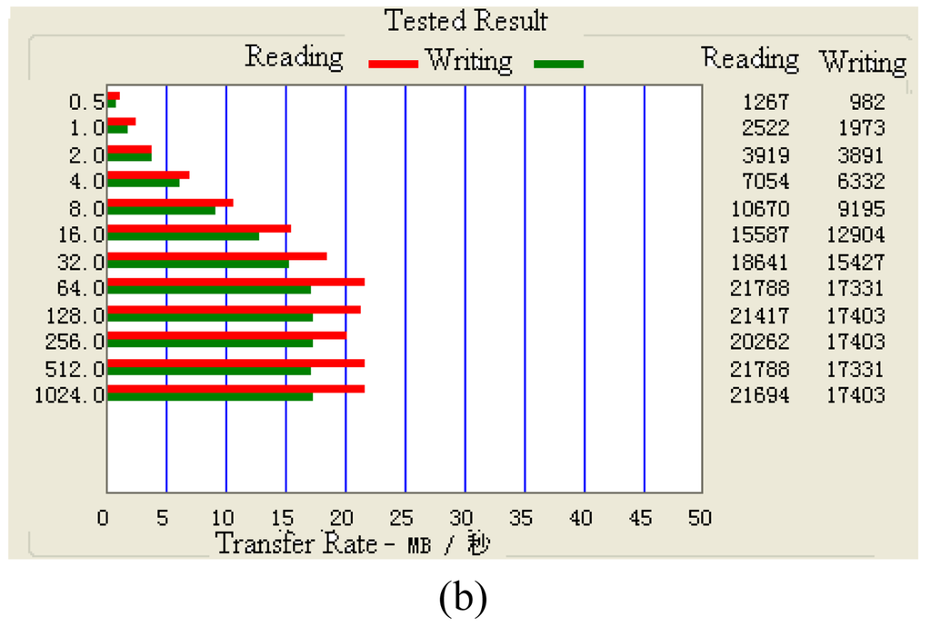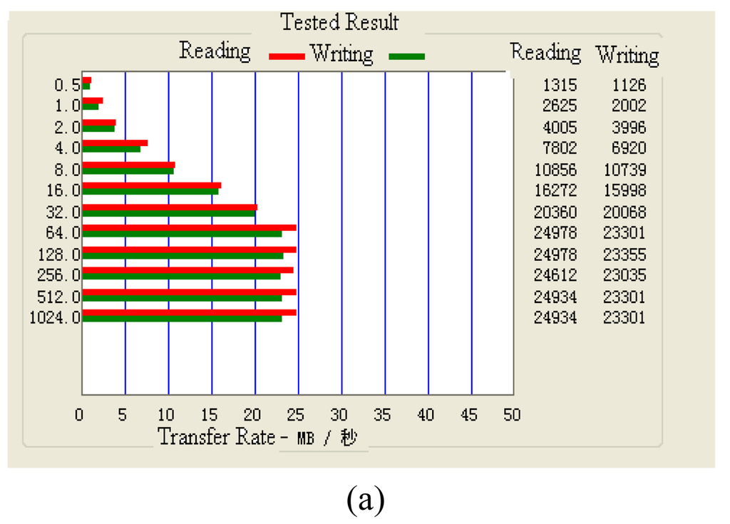 The ATTO disk Benchmark [22] is used in the data transmission speed test experiment. First, we prepared the files in the host computer's hard disk. In succession, we insert the portable hard disk encryption/decryption system to the host computer's USB interface. And the ATTO disk Benchmark is run. Then we copy the test files from the hard disk of the host computer to the tested hard disk. The read/write speed of the hard disk is tested according to different packages sizes, which vary from 0.5KB, 1.0KB, 2.0KB, and till to 1024KB. The test of the read/write speed of the 160G hard disk is shown in Figure 35. If the package size is less than or equal to 64kb, the read/write speed of the hard disk will increase as the package size increasing (Figure 35). When the package size is greater than 64KB, the read/write speed of the hard disk will not increase anymore (Figure 35). Finally, the data reading and writing speed of the hard disk without the portable hard disk encryption/decryption system are 23MB/s and 24MB/s, respectively. The data reading and writing speed of the hard disk with the portable hard disk encryption/decryption system are 17MB/s and 21MB/s, respectively.