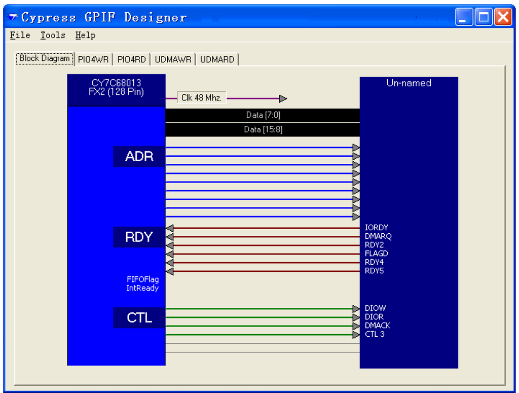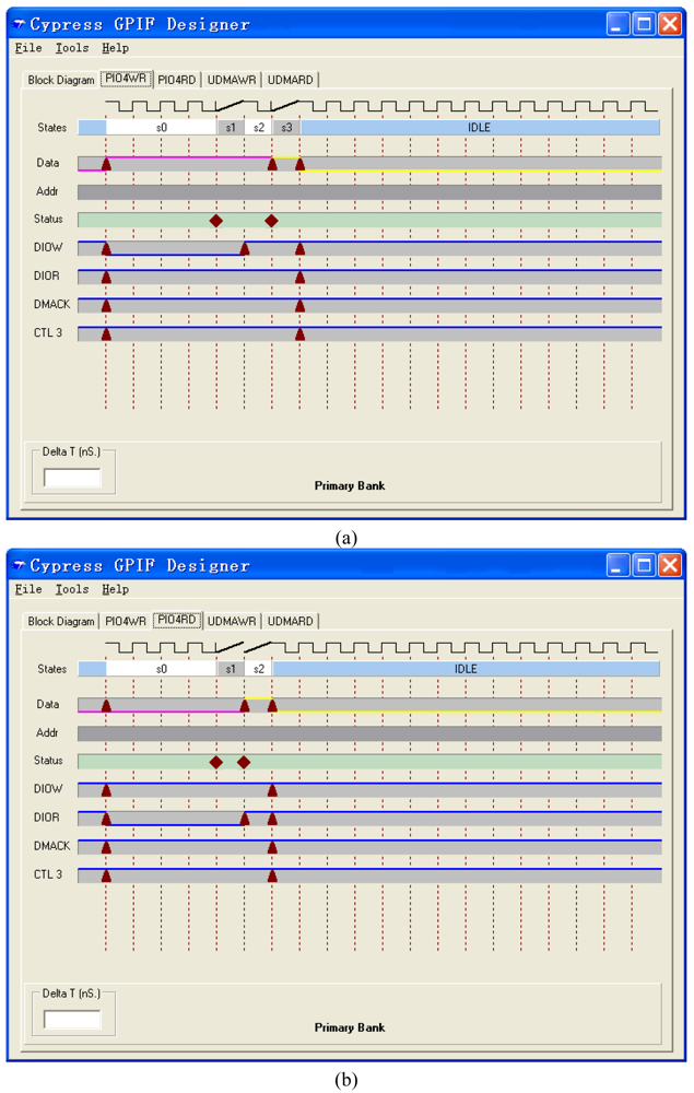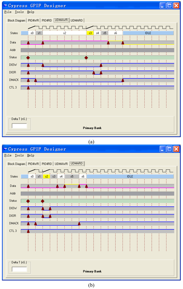 The ATAPI interface is realized by GPIF, whose waveform is designed by the GPIF software of Cypress (Figure 4). The data bus is 16 bits width. The clock frequency of the interface is 48 MHz. The address bus is 9 bits width. The three control output pins are DIOW (the IO writing signal), DIOR (the IO reading signal) and DMACK (the DMA acknowledgement signal). The three input pins are IORDY (the IO ready signal), DMARQ (the DMA acknowledgement signal) and FLAGD (the flag signal). Four waveform descriptors are defined as PIOWR, PIORD, UDMARD and UDMAWR and shown in Figures 5 and 6.