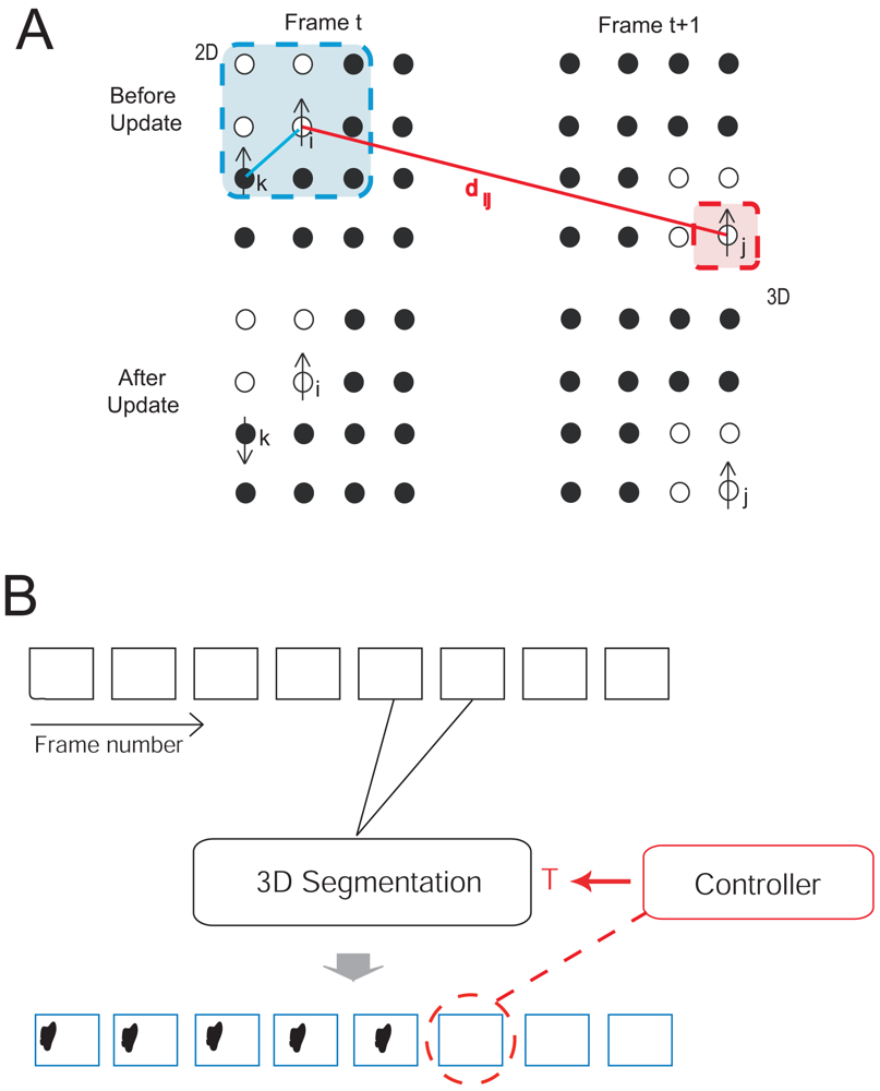 A The spin states (upward and downward pointing arrows) of pixels i, k, and j are shown before and after a spin update for two adjacent frames t and t+1 of an image sequence. The white and black circles indicate pixels of small and large gray values, respectively. Pixel i interacts with pixels k and j in its 2D and 3D neighborhood (shaded areas), respectively, which are in the same spin state. B Pairwise (3D) segmentation of movies. A feedback controller detects segmentation instabilities and adjusts the control parameter T of the core algorithm (3D segmentation) to recover lost segments.