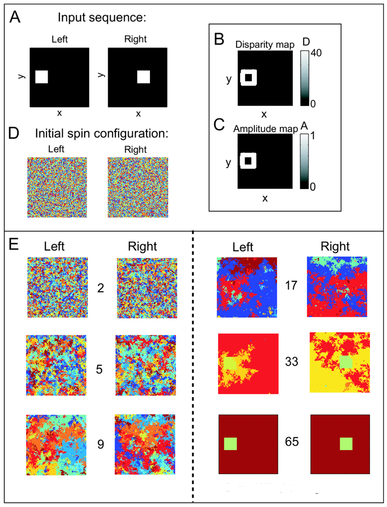 Solid-square stereo pair. A The input image consists of a square which is shifted by a disparity value of 40 pixels from one frame to the other, labeled left and right. B By applying a stereo algorithm, the disparity map D of the stereo pair could be computed, returning reliable disparity values at the edges. C The corresponding amplitude map A reflecting the confidence in the computed stereo values is shown. D The spin states are initialized randomly to values between 1 and 10. E The spin states after 2, 5, 9, 17, 33, and 65 iterations are shown. Progressive agglomeration of clusters of aligned spins can be observed until a stable configuration is reached.
