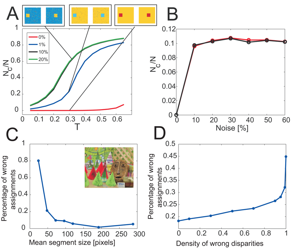 Sensitivity analysis. A The ratio of the total number of clusters Nc divided by the total number of pixels N is plotted as a function of the parameter T for different realizations of Gaussian noise, having standard deviations from the absolute gray-value difference of object and background of 0%, 1%, 10%, and 20%. Here, ground truth disparity was used. The segmentation results are shown for T = 0.3 and different noise levels. B The ratio Nc/N is plotted as function of the noise level using the ground-truth disparity map (red line) and the disparity computed with a phase-based stereo algorithm [26] (black line). C Percentage of wrongly assigned image points as a function of the mean segment length for the Cones stereo pair (left image see inset). Here the ground truth disparity map was used. D Total percentage of wrongly assigned image points as a function of the density of erroneous disparities. Here, the ground truth disparity was corrupted with noise to obtain an erroneous mapping.