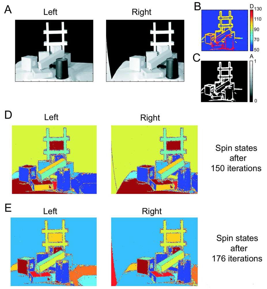 Cluttered-objects stereo pair. A Stereo image pair showing a cluttered scene containing a variety of objects. B-C The dense stereo algorithm returns mainly disparity information the edges of the objects. D-E The spin states computed by the clustering algorithm are shown after both 150 and 176 iterations for easier visual identification of the segments.