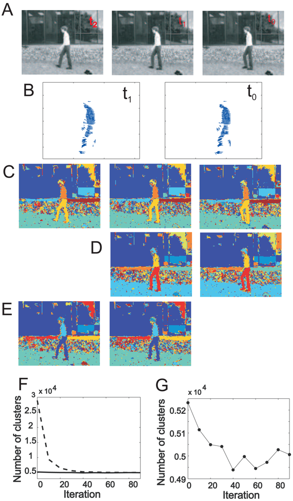 When analyzing long motion sequences, it is inefficient to apply the algorithm to all frames at once because the computational costs increase with the number of pixels. Hence, we split the sequences in pairs of two frames at a time, where the last frame of the previous sequence is identical with the first frame of the next sequence. Then, we initialize the spin states of each sequence with the final spin states of the previous sequence. The spin states for the first sequence containing frame t0 and t1 after 100 iterations are shown in Figure 5D. Then, the algorithm is applied to the next pair, containing frame t1 and t2, where the spin states of both frame have been initialized to the final spin states of frame t1 of the previous sequence. The spin states after 13 iterations are shown in Figure 5E, demonstrating that the number of iterations required to achieve a satisfying segmentation result is greatly reduced by this technique. The number of clusters for the first sequence and the second sequence are displayed as a function of the iteration number in Figure 5F, dashed and solid line, respectively. The number of clusters for the second sequence is plotted as a function of the iteration number at a different scale (Figure 5G). Initially, the number of clusters decreases slightly and then approaches a stable state. In a motion sequence, the number of clusters is expected not to change much from one frame to the next. Mainly the boundaries of the clusters reorganize during the first iterations.