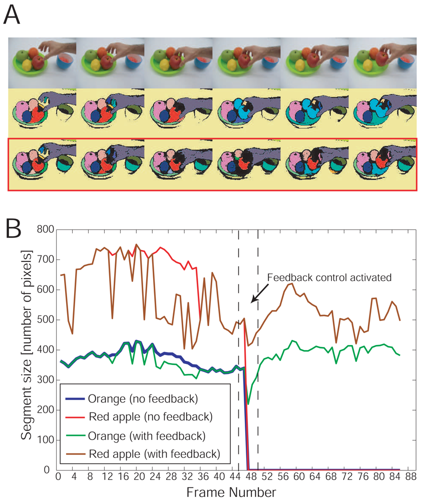 The work of the feedback controller is further illustrated in Figure 6B, where the segment size is plotted as a function of the frame number for the segments representing the red apple and the orange without and with feedback control, depicted as red, blue, brown and green lines, respectively. At frame number 45 the segment sizes of the red apple and the orange drop unexpectedly to zero (red and blue lines), thus indicating a segmentation instability (see Section 2.2). As a consequence, the feedback controller is activated and the temperature of the core algorithm is increased until the original segments are recovered (brown and green lines). The results for the whole movie are shown in Figure 7A.
