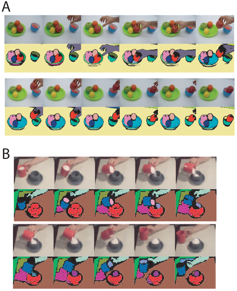 Segment tracking for real movies. A The algorithm (with feedback control) is applied to a movie showing a hand taking an apple from a plate (upper panel). The corresponding segment-tracking results are depicted below. B The results of the algorithm (with feedback control) for a movie showing the filling of a cup are shown. Segment-tracking results for other real movies can be found at http://www.nld.ds.mpg.de/∼eren/Movies.html/.