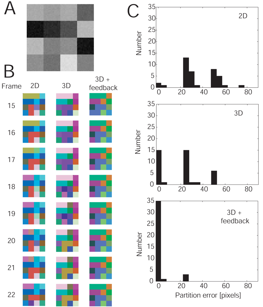 Improving partitioning consistency using 3D linking and feedback control. A From the original image consisting of 4 × 4 uniformly-valued squares, a static image sequence is created by adding Gaussian noise to each frame. B Segmentation results for our algorithm without 3D linking (no tracking), with 3D linking, and with both 3D linking and feedback control. C Respective histograms showing the number of frames as a function of the partition errors (see text).
