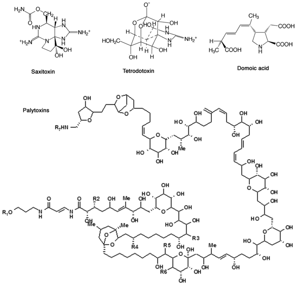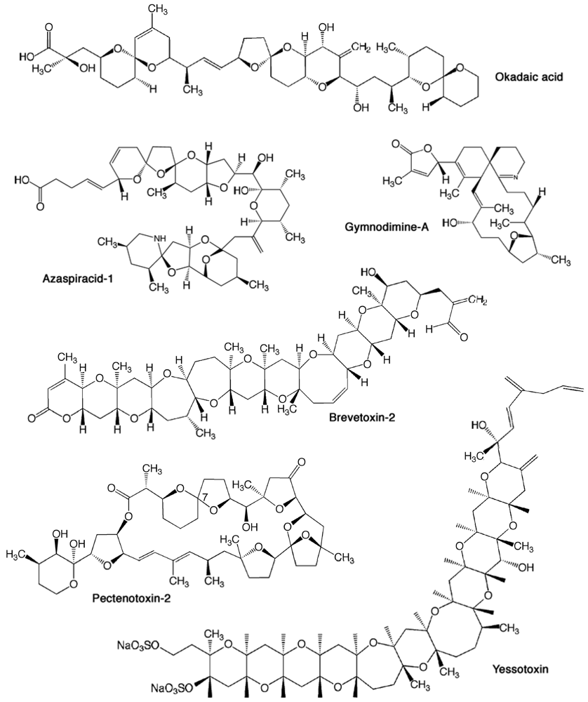 - Cembella, A; Krock, B. Cyclic imine toxins: chemistry, biogeography, biosynthesis and pharmacology. In Seafood and freshwater toxins: pharmacology, physiology and detection, 2nd ed.; Botana, L.M., Ed.; CRC Press: Boca Raton, FL, USA, 2008. [Google Scholar]
