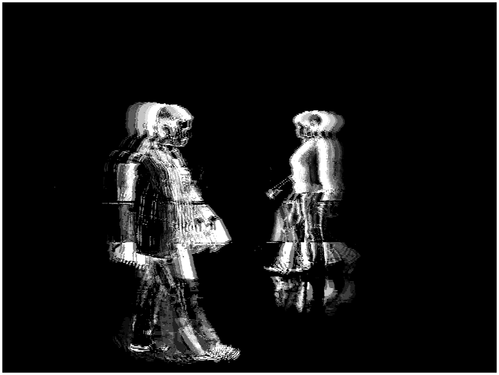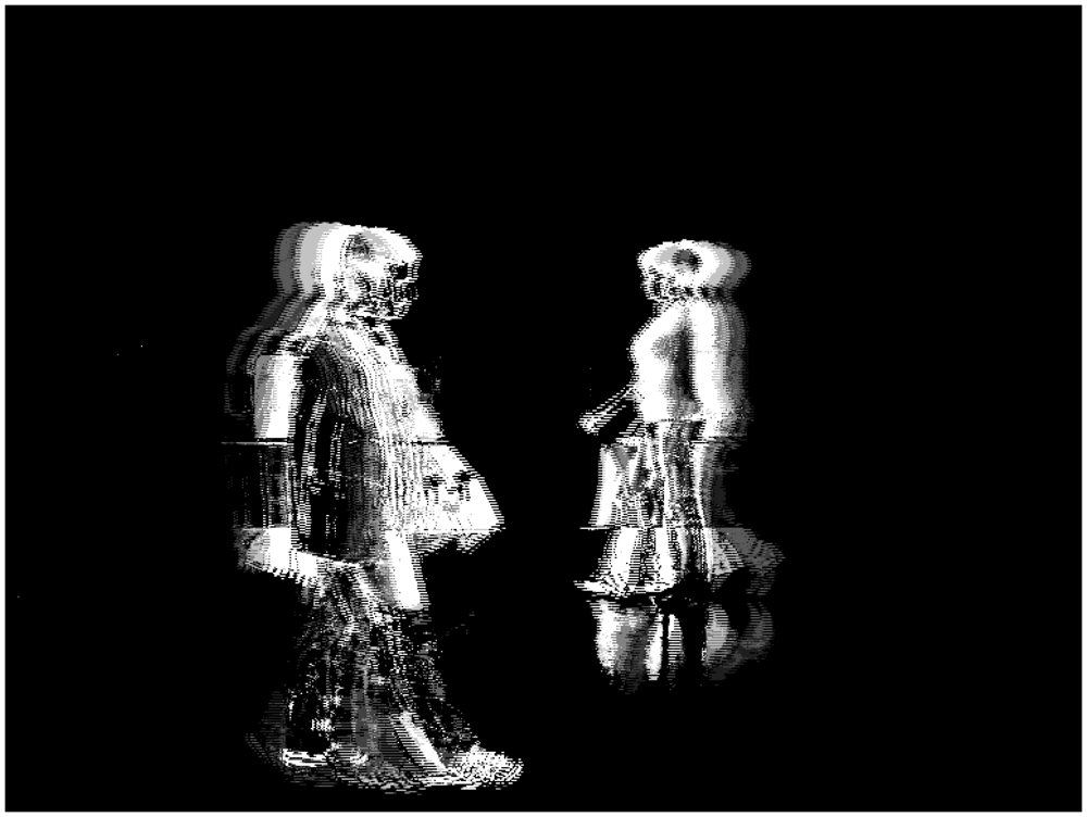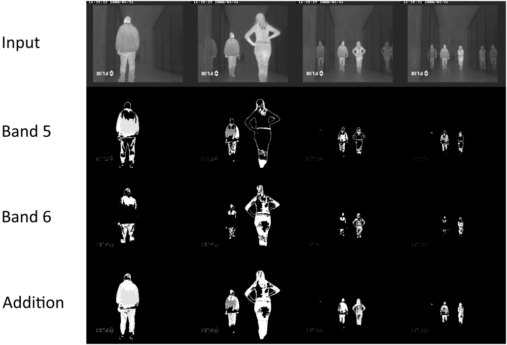 Notice that motion not detected in one band is detected in another one. Notice that the background motion is mainly obtained at bands 2 and 3, whereas the foreground is obtained at bands 4 to 7. Bands 1 and 7 do not offer much information, neither on foreground nor on background motion. A deeper insight into the figure show some interesting results. A gross conclusion is that band 4 mostly gets the contours of the foreground moving elements (people, in this case), whereas bands 5 and 6 show the main parts of the moving bodies. This is why, in this particular case, it seems reasonable to sum up bands 5 and 6 to obtain moving people in infrared imagery. Now, Figure 7 shows the efficiency of the combination of the AC modules corresponding to bands 5 and 6 for segmenting moving people in the sequence.