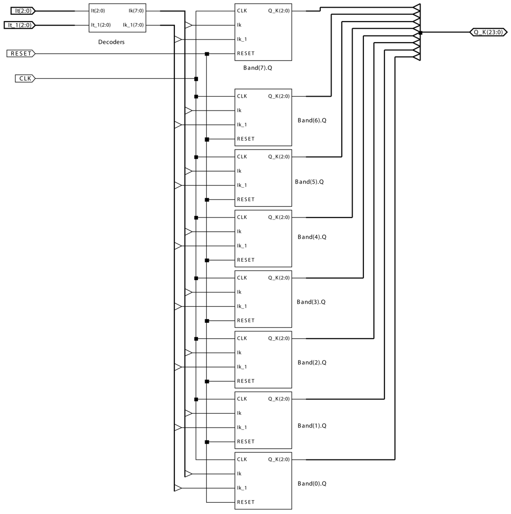 The same Figure 3 includes a series of blocks. There is a block called Decoders and 8 Band(k)_Q blocks associated to the 8 bands. The block Decoders, composed by 2 decoders, has as inputs 3 bits corresponding to the input at time instant t and 3 bits corresponding to the input at time instant t − Δt. The output of this block is an 8 bit vector, where a bit value of 1 is assigned to the position corresponding to band k. The rest of the bits take a value of 0. For instance, if the input to Decoders is 101, the output will be 00100000.