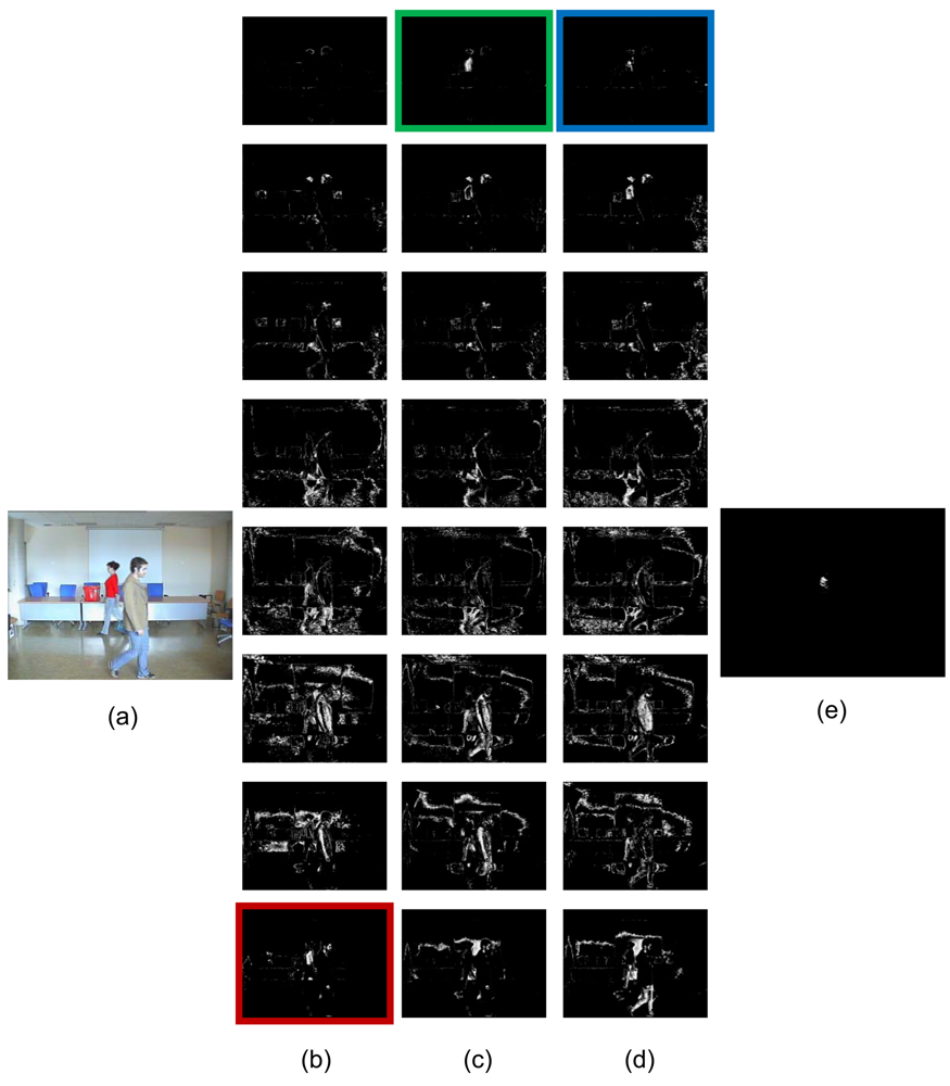 We have used an infrared surveillance sequence captured by our research team, where different persons appear and disappear in the scene. Figure 6 shows the result of the AC detection modules dedicated to one of the eight infrared grey level bands.