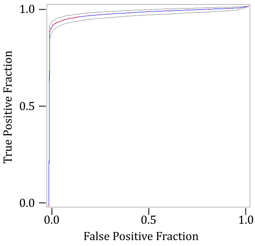 Table 5 shows some statistics about the performance of the algorithm as applied to the complete input video sequence. Also, Figure 9 shows the ROC curve associated. At a first glance, you may observe that the curve grows very quickly and is very close to the maximum value of 1. The area under the curve (see Table 5, “Empiric ROC Area”) is 0.964, which clearly states that our method throws excellent results. The area calculates the method's ability to discriminate between detected and not detected objects.