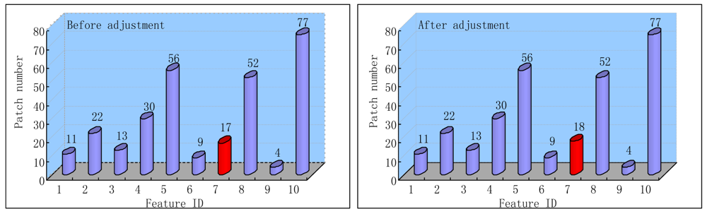 Secondly, we also adjust the patch numbers of each tree's leaf nodes according to the tracked and recovered features. The system initialization performance is not only determined by the offline training process, but also can be ameliorated by the online tracking states dynamically. Figure 1 gives a simple illustration of the adjustment process. For each input frame, the tracked and recovered features are used to reinforce the distributions on the reached leaf nodes by increasing the patch numbers of the feature classes corresponding to them. We only update the leaf nodes of the trees while leaving the internal nodes and the structure of the trees intact. We also take two measures to preserve the diversity and validity of the classification trees. First, we only adjust the trees when the camera pose is estimated correctly. Second, we also select some key positions on the camera trajectory. The adjustment is only carried out when the difference between the current position and the selected ones is larger than the predefined thresholds. The above adjustment is implemented as an individual auxiliary thread, and will not deteriorate the processing time of the online tracking and augmentation obviously.