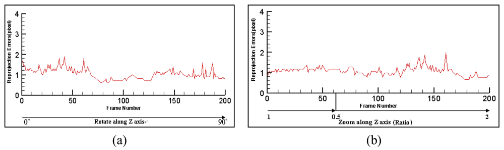 The reprojection errors [,] between the original specified points and their reprojections are compared. In our experiments, the four corners of the man-made marker are used as the specified points. While tracking, the corners of the marker are detected using the ARTOOlKIT library, and their image coordinates are used as the ground truth for comparison. We are especially interested in the reprojection errors under the circumstance of large changes in rotations and zooming ratio. Figure 10a gives the reprojection errors of the proposed method when camera rotates along Z-axis from 0° to 90°. The purpose of this experiment is to simulate the case when users make large changes in view angles. Figure 10b gives the reprojection errors when camera dollies. The purpose is to simulate the case when users move close to or far from the scene. All the above errors are below 2 pixels, which demonstrates the accuracy of the proposed method.