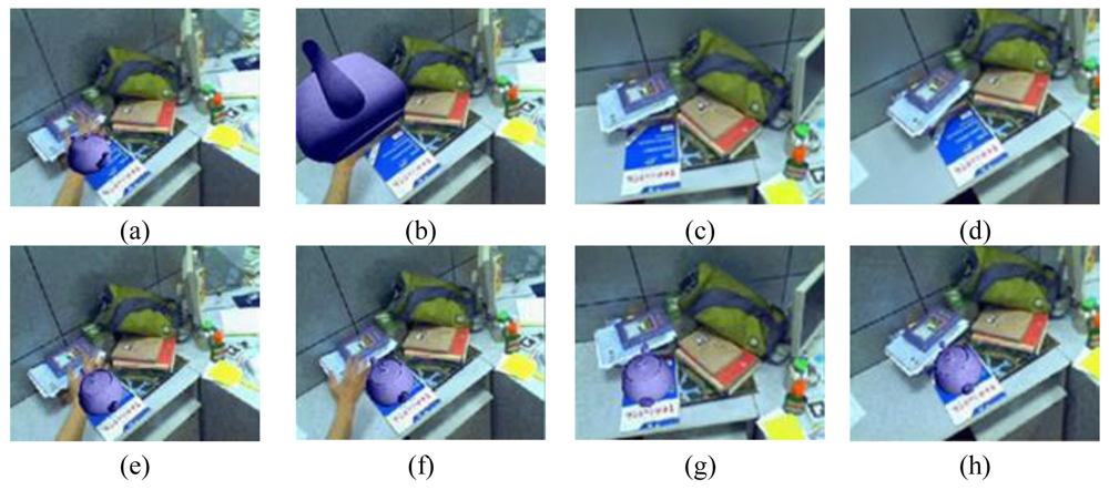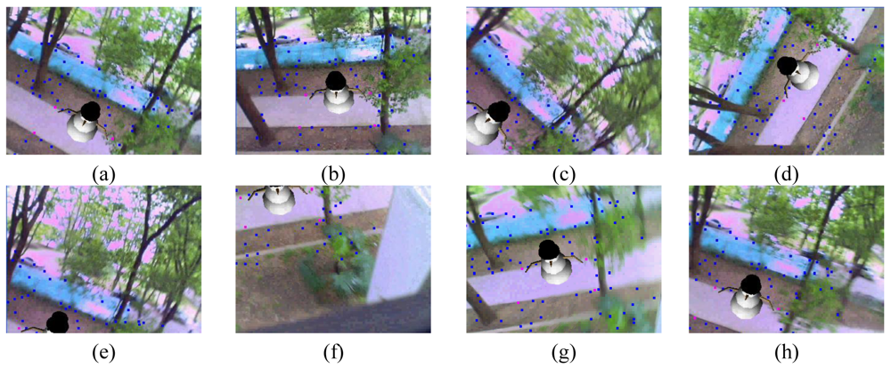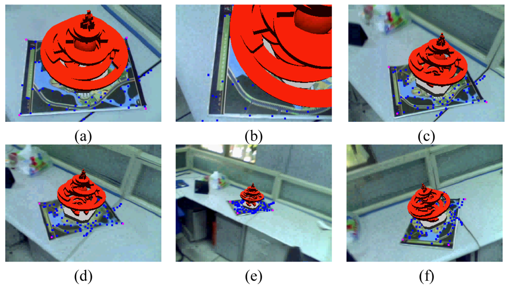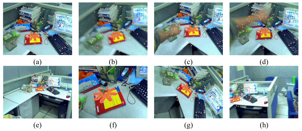 Some augmented images are shown in Figure 4. Figure 4a gives the results when camera moves smoothly. Figure 4b gives the results when moving camera quickly. Figures 4c,d are the results in the case of occlusions. Figures 4e,f give the results when the camera is moving along the Z-axis with significant (4–0.4 times the depth of the reference image) scale changes. We can see that some of the natural features have been moved out of the visual field. However, due to the proposed recovery method, the lost features can be regained when they return to the image again. Thus, we always have a sufficient number of natural features to estimate the corresponding registration matrix. Figure 4g is the results with viewing angle changes. Figure 4h shows the results under the illumination changes. We can see that the virtual object can be augmented accurately under all the above cases. These results demonstrate the validity of the proposed registration method.