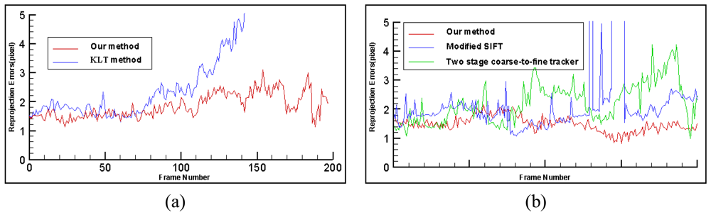 The second experiment is carried out to compare our tracking method with the modified SIFT method [] and two stage coarse-to-fine tracker []. The reprojection errors are used to compare the performance of the above three methods. From Figure 12b, we can see that our method is more stable and accurate than the other two methods, which proves the validity of the proposed tracking method.