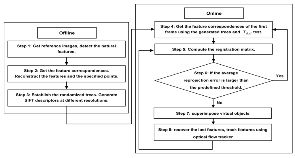 - Step 8: Recover the lost features, adjust trees and SIFT descriptors. Obtain the corresponding natural features between the next and reference frames using optical flow tracker and RANSAC and turn back to the step 5.