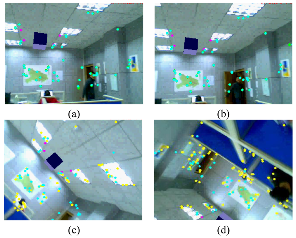 The second experiment is used to validate the performance of the adaptive classification trees. From Figure 5, we can see that with the online dynamic adjusting, the system can recover from failures even when current cameras (Figures 5c,d) are different from the reference poses (Figures 5a,b) to a large degree (the yellow points are the detected features and the green points are the inliers used to initial the tracking systems).