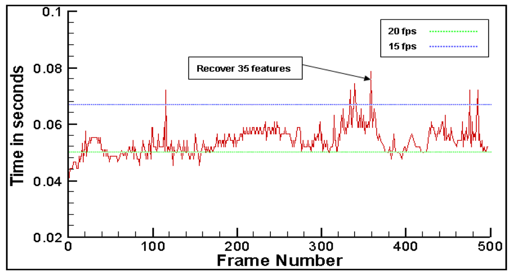 The system can run the proposed method at a speed of about 16 fps without the use of complicated virtual models. Figure 8 gives the processing time per frame during tracking 128 features. In this experiment, 87 feature points have been moved out of the field of view or occluded by users extremely. The processing time is always within 0.08 second which demonstrates that our method is fast enough for real time applications. We also testify the validity of the proposed feature recover method. In the experiment, 16 feature points have been occluded by user's hand frequently when moving camera. Figure 9 shows the average percentage of correct recovering for each feature for normalized cross-correlation method [,] and our method. Note that recovery performance is significantly better when the proposed method is used.