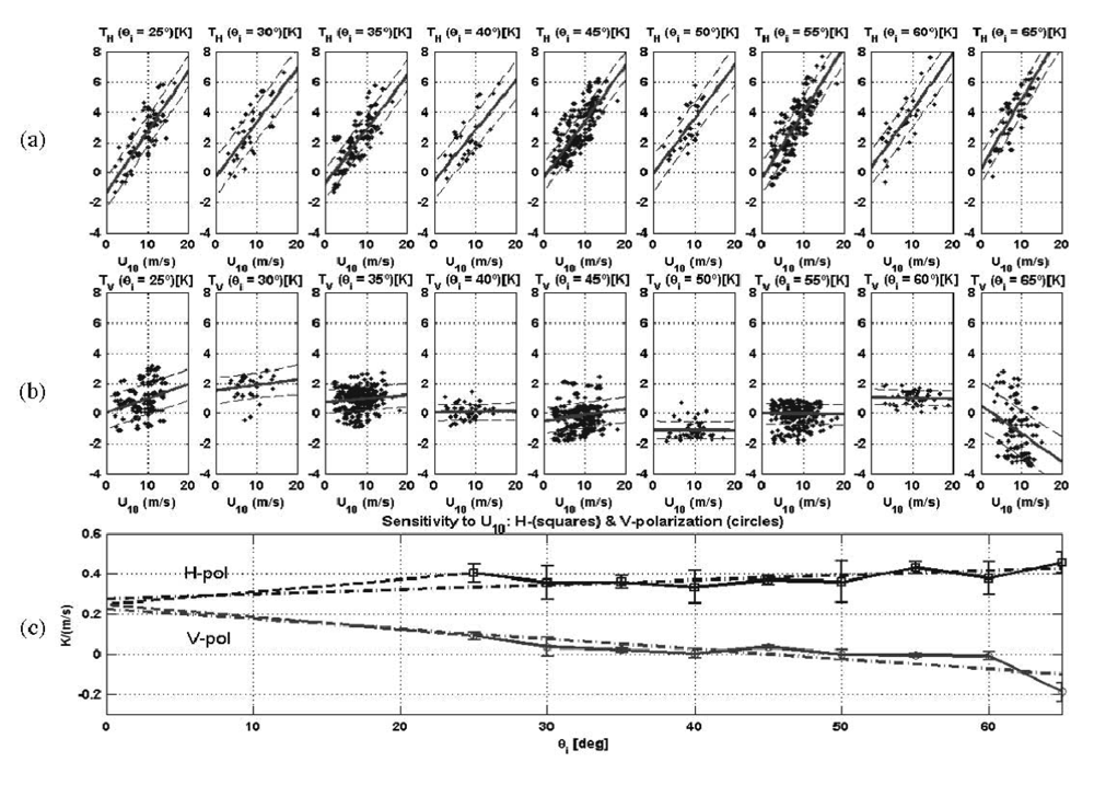 Derivation of the brightness temperature sensitivity to wind speed. Scatter plots of the brightness temperature change at (a) horizontal (ΔTB h) and (b) vertical (ΔTB v) polarizations vs. the 10-m height wind speed (U10). Solid line: linear fit, and dashed lines: percentile 50% as a function of U10 for incidence angles from 25° to 65°. (c) Derived TB h,v sensitivity to wind speed as a function of (solid line) polarization and incidence angle, associated ±1 σ error bars, and (dashed lines) linear fit. All data points used (Figure 6 from [3]).