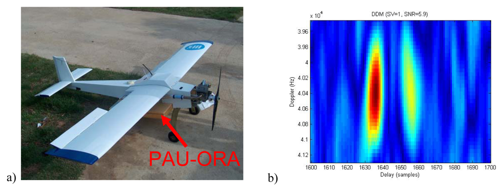 Figure 11a shows the PAU-One Receiver Airborne on the bay of a remote controlled aircraft. Details on the control, telemetry, data links and data storage can be found in [20-22]. Figure 11b shows the DDMs measured when the direct (RHCP) and reflected (LHCP) signals are collected simultaneously using two different antennas connected to the inputs of a non-resistive 2-way power combiner. The left-hand side peak corresponds to the direct signal, which has a larger amplitude, while the right-hand side one corresponds to the reflected one, which is attenuated in the scattering and in the longer signal path. The separation between peaks is 21 samples, which correspond to ∼770 m, since in this implementation of the instrument, the sampling frequency is 8.1838 MHz. Therefore, since the antenna was pointing to the nadir direction and the GPS satellite was close to the zenith, the estimated height is ∼385 m, which is very close to the flight height (379 m). This design offers several advantages over the previous ones (just measuring the reflected signal) since it intrinsically provides absolute calibration of the scattering coefficient (ratio of peaks between direct and reflected DDM), if offer altimetry capabilities, and sea state determination using the full DDM, as shown in Section 3.