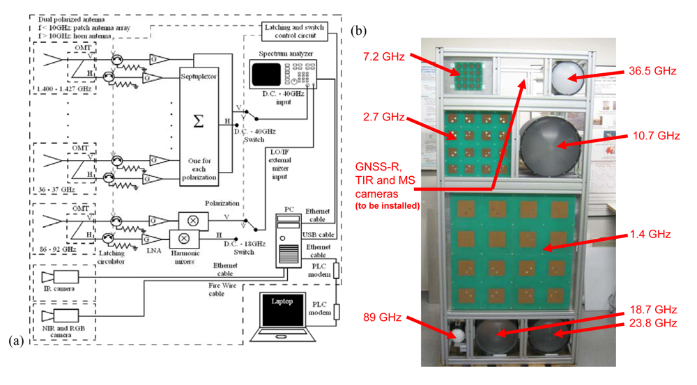 (a) MERITXELL microwave radiometer schematic, and (b) front view.