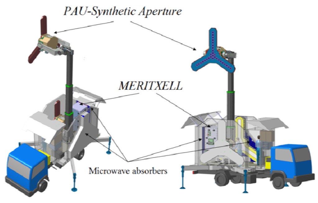 At the time of writing this manuscript the construction of a truck with a telescopic robotic mast to hold and orient both the PAU-Synthetic Aperture and MERITXELL instruments is being finished. It has been designed to hold one of these two instruments up to a 8 m height above the ground level, while the other is in the parking position (e.g., MERITXELL in Figure 13), and withstand up to 100 km/h wind loads. Figure 13 shows a view of the PAU-Synthetic Aperture instrument deployed, and the MERITXELL instrument in the parking position. Each has their own panel of microwave absorbers for calibration purposes.