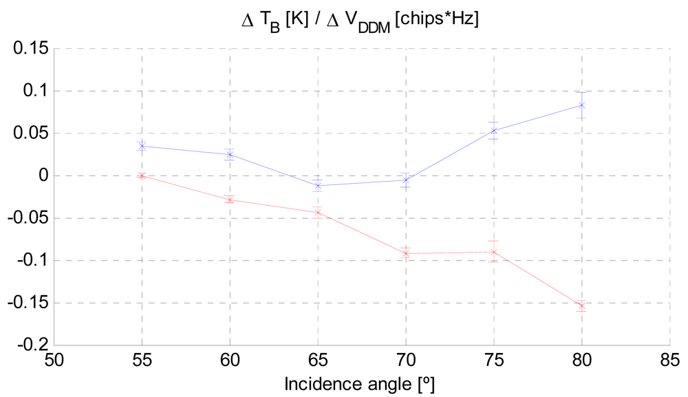 The correlation of the instantaneous brightness temperature changes and the instantaneous DDM volumes observed during ALBATROSS 2009 is shown in Figure 16 for incidence angles larger than 55°, since the cliff already imposed a 45° mask, and incidence angles between 45° and 50° were affected by multi-path.