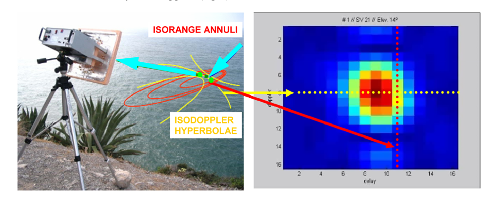 When observing the GNSS reflected signals, two points over the sea surface correspond to the same delay and Doppler coordinates, with minimum delay corresponding to the specular reflection point (Figure 3). In PAU it was proposed to measure the complete Doppler-Delay Maps (DDMs) to make the sea state correction of the brightness temperature required for the salinity retrieval. The DDM is the square of the absolute value of the correlations of the reflected GNSS signals with local replicas of the transmitted signal, but shifted in delay and Doppler, and it is given by [6]: