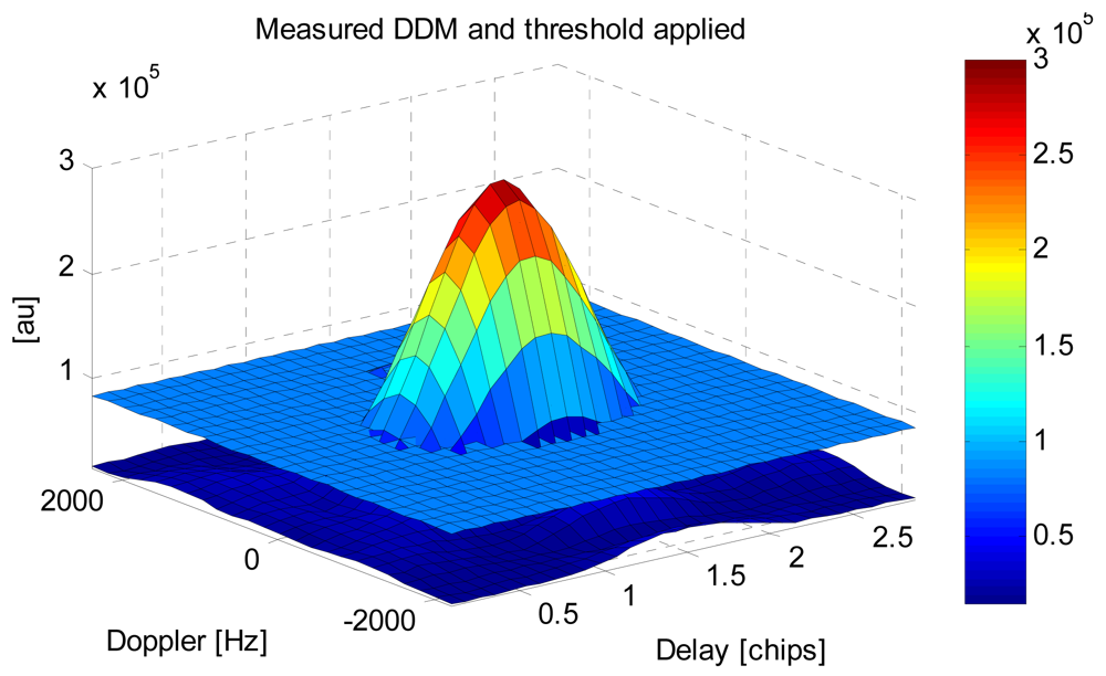 The volume of the normalized DDM (peak amplitude equal to 1) above a given threshold (Figure 4) has been found to provide a measurement of the area over which the GNSS signals are scattered, and it can be related to geophysical variables such as the sea surface roughness, without need of any intermediate model, either numerical to compute the scattering or for the sea surface spectrum [7,8].