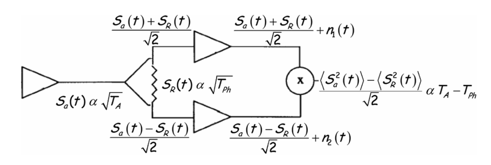 As compared to a real aperture radiometer, instead of connecting the antenna output directly to the radiometer receiver, it is connected to the input of a Wilkinson power splitter that divides the signal in two signals that are in phase. However, the 100 ohm resistor of the Wilkinson power splitter that connects the two outputs also adds two noise signals that are 180° out-of-phase.