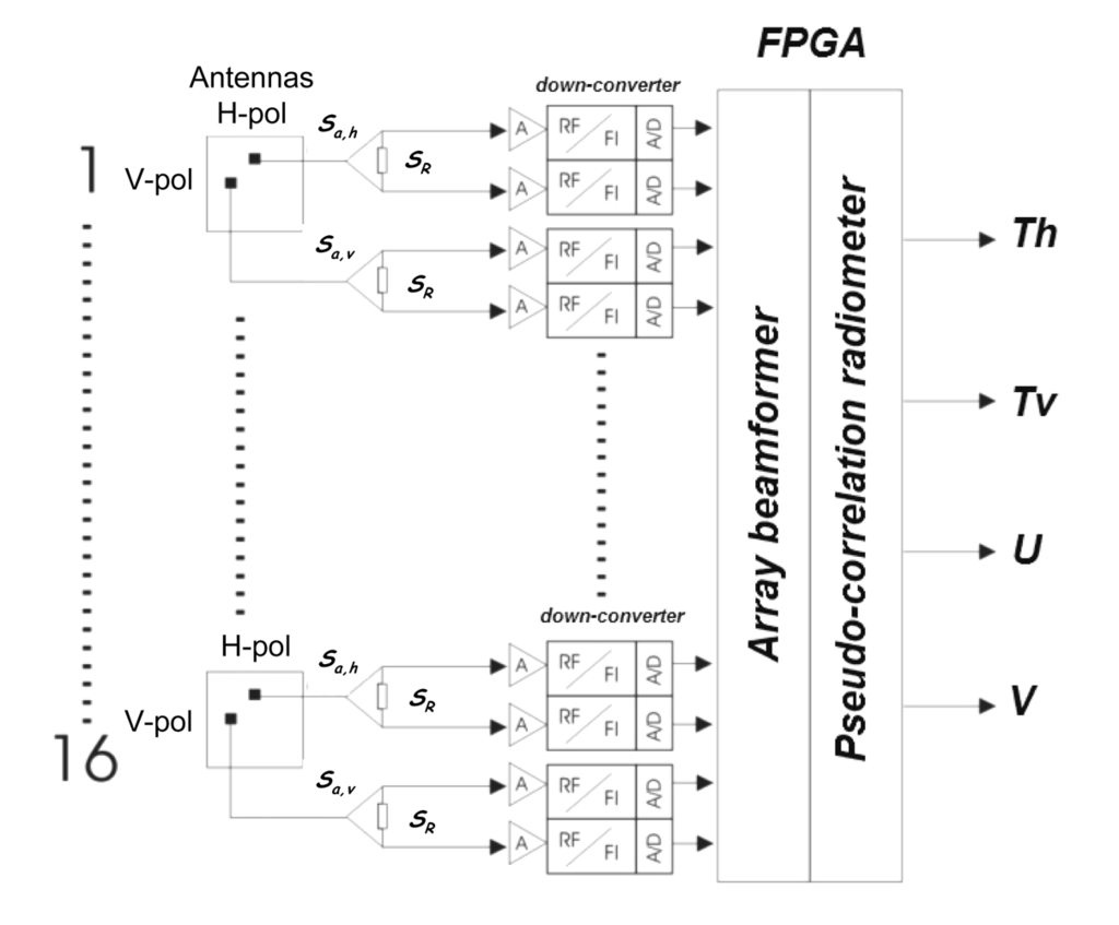 The extension to the N-element case is straightforward although technology challenging. Instead of one antenna, there are N-dual polarization antennas, whose outputs are connected each to a Wilkinson power splitter. After amplification, down-conversion, and sampling, the N-outputs at each polarization are combined with the ones from other receivers with the appropriate amplitude and phases so as to digitally form the beam(s). The final output of each beam is obtained by cross-correlating the upper and lower branches, corresponding to the sum and difference signals (Figure 5). If the vertical-polarization signals are cross-correlated, the antenna temperature at vertical polarization is measured. If the horizontal-polarization signals are cross-correlated, the antenna temperature at horizontal polarization is measured. And if the vertical-polarization signal is correlated with the horizontal-polarization one, the third and the fourth Stokes elements are measured, as twice the real and imaginary parts of the complex cross-correlation. Note that, since the vertical and horizontal channels do not share a Wilkinson power splitter, there is no “Dicke effect” (output proportional to the difference between the antenna temperature and the physical temperature of a reference) for the third and fourth Stokes parameters. Figure 6 shows the schematic of the whole PAU-Real Aperture instrument.
