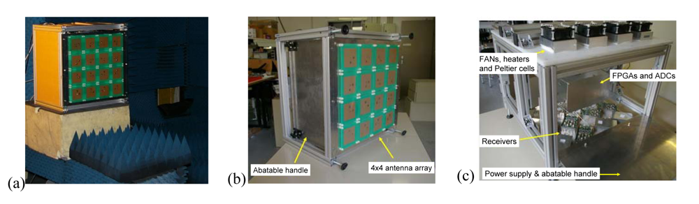 (a) PAU-Real Aperture without radome in UPC anechoic chamber for testing beamforming performance, (b) front view of the 4 × 4 element array, and (c) inside of the instrument showing the distribution of the dual-polarization receivers, FPGAs for data processing, and the temperature control.