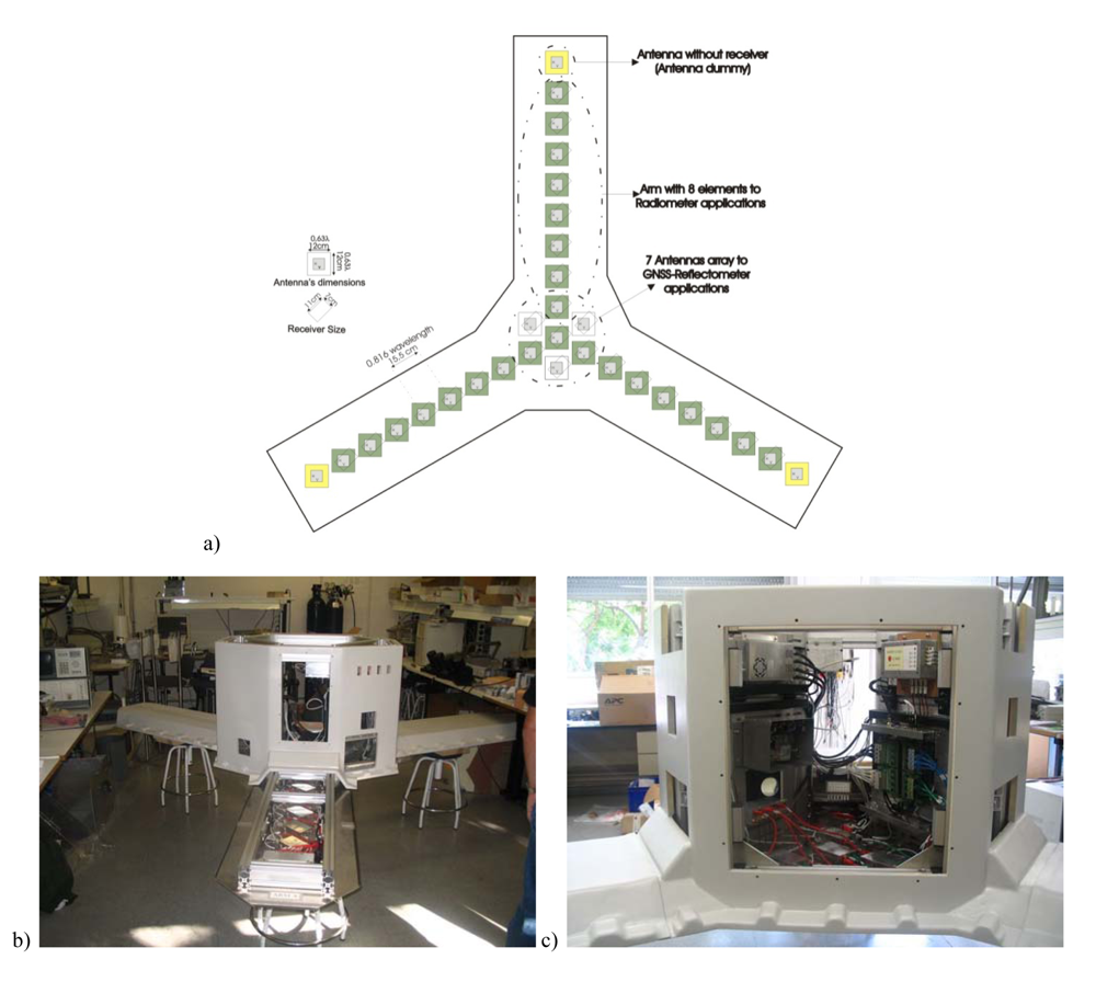 Figure 12a shows the schematic of the MERITXELL microwave radiometer, and Figure 12b shows the front view with the antennas mounted (cameras and PAU/GNSS-R will be placed in the hole in the center of the top row).
