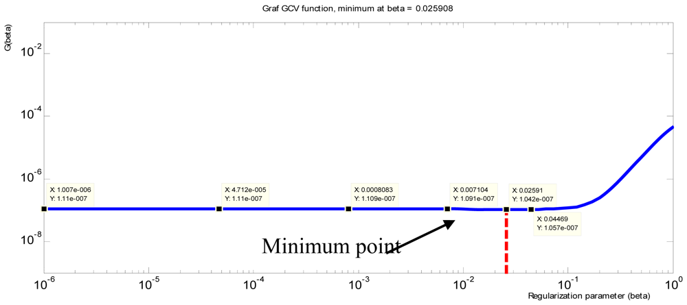 where SI is a matrix which produces the regularized solution qST when multiplied with V, i.e., SI = (STS + (β2)I)ST. GCV method indeed seeks to balance the perturbation and regularization errors and thus, in turn, is related to the corner of L-curve []. Figure 10 shows the GCV curve with optimization value for regularization parameter obtained using Matlab tools programming []. From the graph, the minimum point is 0.025908 as labeled in Figure 10.
