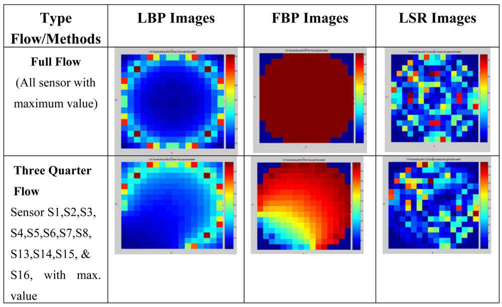 Simulation images for different types of flow pattern using LBP, FBP and LSR methods.