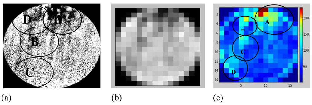 Figure 14 shows the images captured by the CCD camera with different processing modes as discussed in 4.3.1. Figure 14(a) is the real image with identified sensing area. Figure 14(b) is the image of Figure 14(a) after being resized to a 16 by 16 matrix with gray color. Figure 14(c) is the image of Figure 14(b) after converted to color mode-using MATLAB.